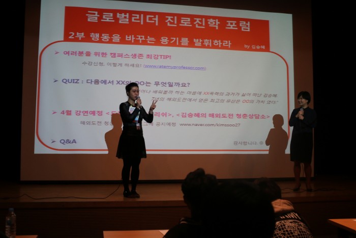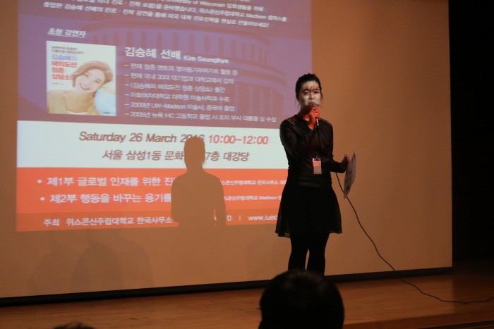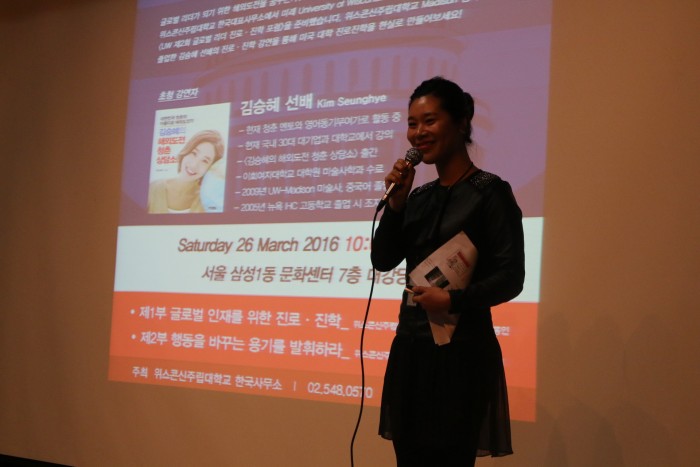 3/26 제2회 글로벌리더 진로·진학 포럼 페이지 정보 작성자 관리자 작성일16-03-28 17:43 조회4,045회 댓글0건 이전글 다음글 목록 본문 안녕하세요 위스콘신대학교한국대표입니다! :) 김승혜 작가이자 위스콘신대학교 매디슨 캠퍼스 선배와 함께 했던 제 2회 글로벌 리더 진로·진학 포럼 이전글 다음글 목록