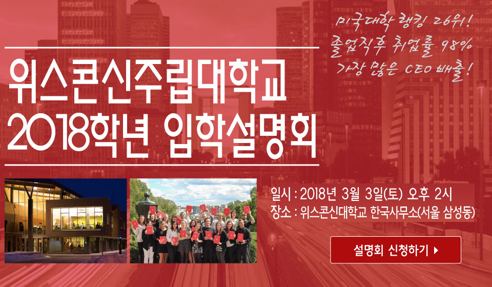위스콘신 주는 26개의 UW (University of Wisconsin) 위스콘신주립대학교가 13개의 4년제주립대학교들과 또한 13개의 2년제 주립대학교들로 이루어진 독특한 주립대학교 System을 가지고 있습니다. 예를 들자면, UW-Madison, UW-Milwaukee, UW-Oshkosh, UW-Barron County 등 입니다. TOEFL 점수가 없어도, WESLI에서의 Academic English 과정을 마치는 조건으로 입학을허가 해 주는 조건부 입학을 시행 할 정도로 대부분의 University of Wisconsin 에서는 WESLI의 영어교육을 높이 평가하고 있습니다. 또한, 같은 시스템 내에서 좋은 성적을 유지하면 UW-Madison을 포함한 모든 대학교로 자유롭게 편입을 할 수 있으므로, UW-Madison을 최종 목표로 하는 학생들이 영어를 준비하기에 더할 나위 없이 좋은 장소가 될 수 있을 것입니다.